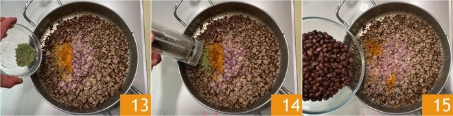 Añade también el orégano seco 13 y la pimienta 14. Por último, agrega los frijoles 15.