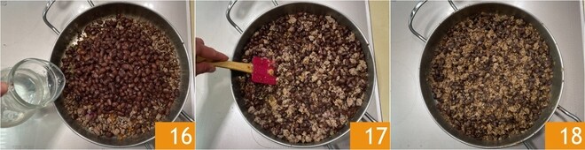 Vierte el agua 16 y mezcla bien 17, luego continúa cocinando a fuego medio durante unos 15 minutos. Debes obtener una especie de ragú bastante seco 18.