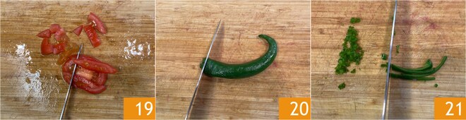 Mientras tanto, prepara el pico de gallo: lava y corta los tomates en cubos de aproximadamente 1 cm 19 y transfiérelos a un bol. Corta el chile jalapeño 20, quita las semillas internas y pícalo finamente 21.