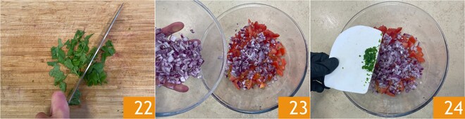 Pica finamente también el perejil 22 y la cebolla. Vierte la cebolla 23 y el chile en el bol con los tomates 24.