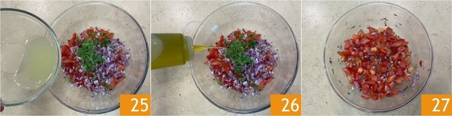 Condimenta con el jugo de lima 25, aceite 26 y sal, luego mezcla bien y reserva 27. Finalmente, corta el cheddar y el edamer en pequeños cubos.