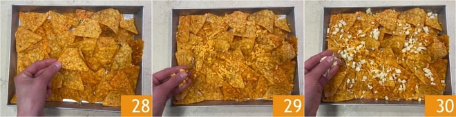 Estás listo para ensamblar todo: coloca los nachos en una bandeja de 21x28 cm 28, luego espolvorea con parte del cheddar 29 y del edamer en cubos 30.