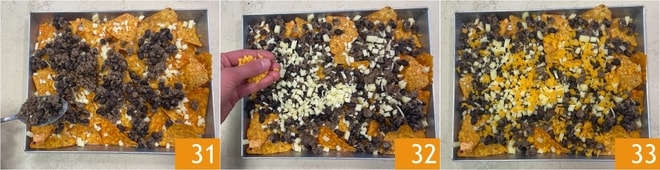 Distribuye la carne por toda la superficie 31, luego cubre con el queso restante 32. Cocina en horno con ventilador precalentado a 220° durante unos 5 minutos 33.