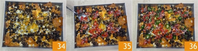 Cuando el queso se haya derretido, saca la bandeja 34 y adorna con el pico de gallo 35, algunas rodajas de jalapeño y cilantro fresco picado. ¡Tus nachos con carne están listos para ser disfrutados 36!