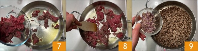 En la misma cacerola, calienta otro poco de aceite, luego añade la carne picada de res 7 y sofríe bien, desmenuzando la carne con la cuchara 8. En este punto, agrega el picado de ajo y cebolla que reservaste 9.