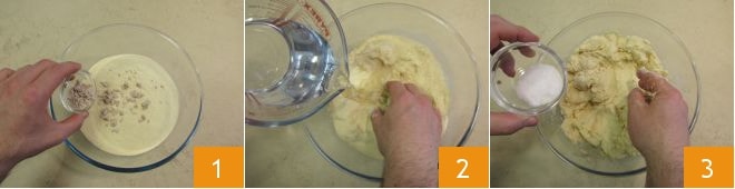 Para realizar las 'nfigghiulate, primero prepara la masa: pon la sémola en un bol y desmenuza la levadura de cerveza en su interior 1, luego vierte el agua poco a poco mientras amasas con la otra mano 2. Después de haber incorporado el agua, añade también la sal 3.