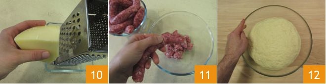 Finalmente ralla el caciocavallo con un rallador de agujeros grandes 10 y desmenuza la salchicha en un bol, quitando la tripa 11. Transcurrido el tiempo de levitación, la masa habrá aumentado de volumen 12.