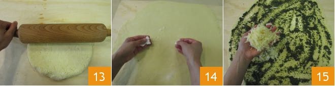 Extiende la masa con un rodillo hasta un grosor de 1 mm 13, luego unta la hoja con una nuez de manteca 14. Distribuye el pesto de mentuccia sobre toda la superficie y espolvorea con el caciocavallo rallado 15.
