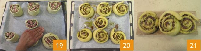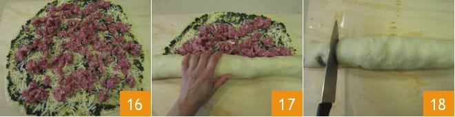 Añade también la salchicha desmenuzada 16 y enrolla la hoja 17, luego divide el rollo obtenido en rodajas de aproximadamente 6 cm de grosor 18.