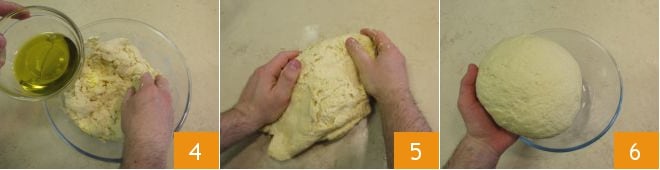 Finalmente agrega el aceite poco a poco 4 y continúa trabajando hasta que la mezcla sea homogénea 5. Transfiere la masa a un bol 6, cubre con film transparente y deja que leve durante al menos 3 horas a una temperatura de 26°-28°.