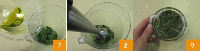 Mientras tanto, lava y seca la mentuccia, colócala en un recipiente alto y estrecho y añade el aceite 7. Tritura con una batidora de inmersión 8 hasta obtener una consistencia cremosa. Cubre el pesto obtenido con film en contacto 9 y consérvalo en el frigorífico hasta el momento de usarlo.