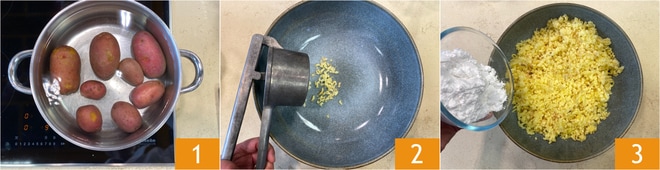 Para preparar los ñoquis sin gluten primero cuece las patatas rojas en una olla comenzando con abundante agua fría. Cocina durante unos 40 minutos desde que hierve o hasta que el tenedor entre fácilmente en el centro 1. Tritura las patatas mientras están todavía calientes (la piel quedará dentro del prensa patatas) 2, luego añade la fécula de patata 3.