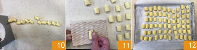 Corta los rollitos en trozos de 2-3 cm 10, luego pásalos delicadamente por el rizado para ñoquis 11 y colócalos poco a poco en una bandeja con papel de horno 12. ¡Tus ñoquis sin gluten están listos para ser cocidos y condimentados al gusto!