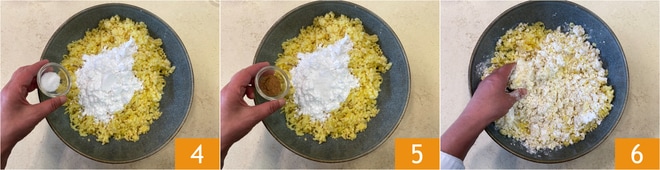 Añade también la sal 4 y abundante nuez moscada 5. Amasa a mano para mezclar los ingredientes 6.