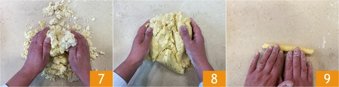 Transfiere la mezcla a la superficie de trabajo y sigue trabajando 7 hasta obtener una masa suave y homogénea 8. Envuelve la masa en papel film y deja reposar durante al menos 30 minutos. Pasado el tiempo de reposo, divide la masa en porciones más pequeñas y extiéndelas para formar rollitos de unos 2 cm de grosor 9.