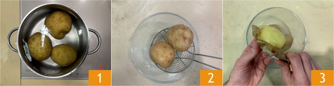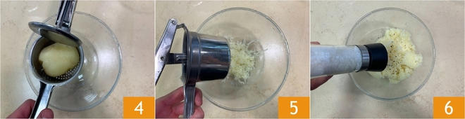 Pásalas por un prensapatatas 4 y recoge el puré en un bol 5. Salpimienta 6.