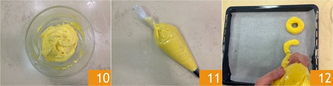 Trabaja con la cuchara hasta obtener una masa compacta y homogénea 10. Pásala a una manga pastelera con boquilla estriada de 16 mm 11. Forra una bandeja de horno con papel pergamino, exprime la masa aquí para formar los nidos, haciendo un círculo y sobreponiendo sobre él otro círculo 12.