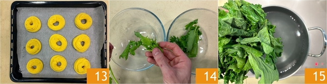 Cada nido debe tener dos capas de masa y 8-9 cm de diámetro 13. Hornea en un horno ventilado precalentado a 220°C durante 15 minutos en la rejilla del medio. Mientras tanto, limpia los grelos, separa las hojas del corazón central 14, hierve las hojas durante 3 minutos 15.