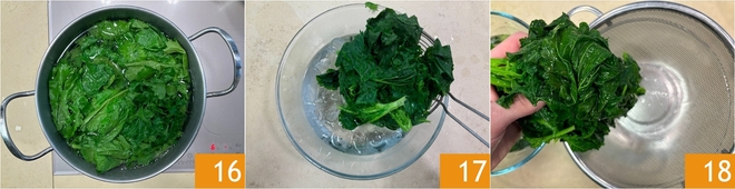 Añade los grelos y déjalos cocinar durante otros 3 minutos 16. Enfríalos en agua con hielo 17, luego escúrrelos 18.