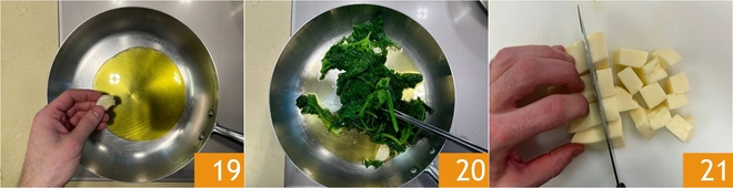 Calienta en una sartén un poco de aceite con un diente de ajo 19, saltea los grelos durante unos 5 minutos, elimina el ajo y reserva 20. Corta la provola en trozos pequeños 21.