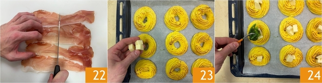 Divide a la mitad las lonchas de speck 22. Recupera del horno los nidos cocidos, distribuye en el centro los cubos de provola 23. Luego rellena encima con los grelos 24.