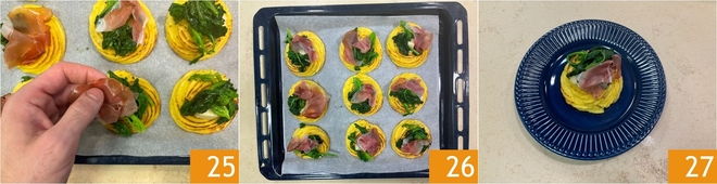 Completa con las lonchas de speck 25. Hornea nuevamente durante 3 minutos a 200°C en modo ventilado 26. Sirve los nidos de patatas duquesa con grelos calientes 27.