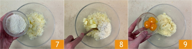Añade mantequilla y Parmesano 7 y mezcla con una cuchara 8. Una vez que la mezcla se haya enfriado, incorpora las yemas de huevo 9.
