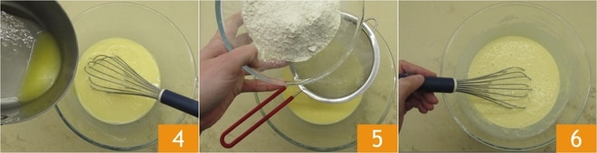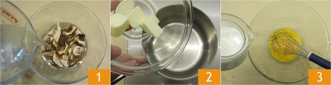 Para preparar los nidos de setas, crema de calabaza y mozzarella, primero ponga a remojo las setas secas en agua fría 1. Mientras tanto, prepare la masa para las crepes: derrita la mantequilla en un cazo 2 y deje que se temple. En un bol, bata los huevos con una varilla, luego vierta la leche 3 y mezcle nuevamente.