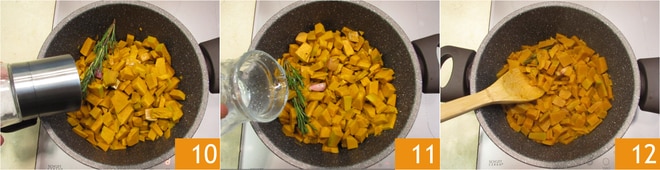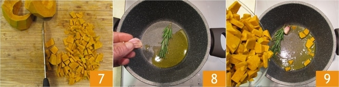 Pasemos a la crema de calabaza: limpie la calabaza y corte la pulpa en cubos irregulares 7. En una olla, caliente el aceite con el romero y un diente de ajo sin pelar 8, luego agregue los cubos de calabaza 9.