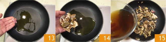 Mientras se cuece la calabaza, escurra las setas, filtre el agua de remojo y resérvela. En una sartén, caliente un poco de aceite con un diente de ajo sin pelar 13, luego agregue las setas 14 y unos 300 g de su agua 15.