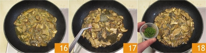 Cocine a fuego medio durante unos 20 minutos 16, luego retire el ajo 17 y aromatice con el perejil picado 18. Reserve las setas.