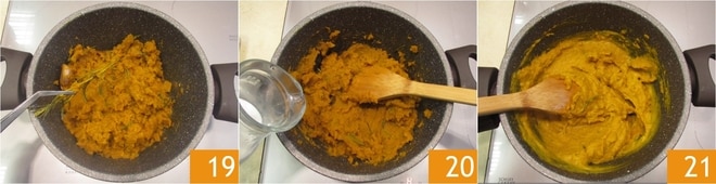 En este punto, la calabaza estará cocida, así que apague el fuego y retire el ajo y el romero 19, luego añada la leche 20 y mezcle bien hasta obtener una crema 21.