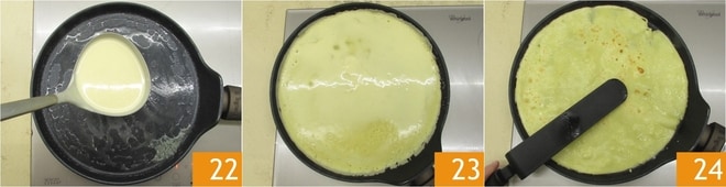 Ahora puede cocinar las crepes: ponga al fuego una sartén para crepes (o una sartén antiadherente) de 28 cm de diámetro y úntela con un poco de mantequilla, luego vierta en el centro un cucharón de la mezcla 22 y gire la sartén para distribuirla uniformemente (o use la espátula especial). Después de aproximadamente un minuto a fuego medio-bajo, los bordes comenzarán a despegarse 23, luego voltee la crepe y cocínela durante un minuto también del otro lado, debe quedar ligeramente dorada 24. Proceda de esta manera hasta terminar toda la masa, apilando las crepes en un plato.