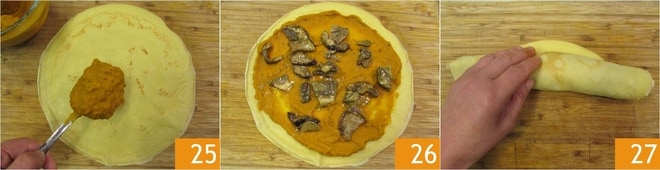 Está listo para montar el plato: unte cada crepe con la crema de calabaza 25, añada algunas setas 26 y enróllela 27.