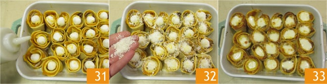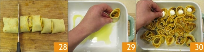 Recorte los bordes del rollo y divídalo en partes de unos 4 cm de ancho 28; con estas cantidades obtendrá aproximadamente 20 piezas. Coloque los rollitos obtenidos en una fuente de horno previamente engrasada con aceite, colocándolos de pie uno al lado del otro 29. Finalmente, añada una pequeña mozzarella en la cima de cada nido 30.