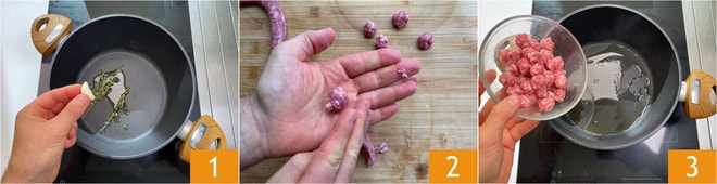 Para preparar los nidos de tallarines, verted un chorrito de aceite, el ajo y las ramitas de tomillo en una cacerola, dejad calentar a fuego lento 1. Desgranad la salchicha directamente a mano para obtener más fácilmente bolitas de aproximadamente 1 cm 2. Retirad los aromas del fondo y verted las albóndigas 3.