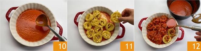 Verted la salsa en una fuente para horno 10 de 23 cm en la base y 27 cm en la superficie. Distribuid los nidos de tallarines 11, Cubrid con más salsa y albóndigas 12.