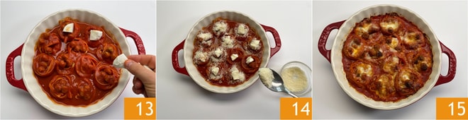 Distribuid en la superficie los trocitos de mozzarella Fiordilatte 13 y el Parmigiano rallado 14. Cocinad en horno ventilado precalentado a 200°, durante unos 20 minutos. Al final de la cocción, dejad reposar unos minutos y servid con albahaca al gusto.