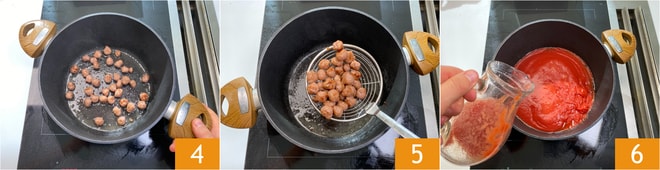 Haced chisporrotear a fuego vivo los trocitos 4. Cuando estén bien sellados, retirad la salchicha y reservad 5, verted la salsa 6 y 500 g de agua.