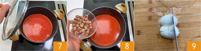 Poned un poco de sal, cubrid con la tapa 7 y cocinad a fuego medio durante media hora. Pasado el tiempo, sumergid las albóndigas 8 y dejad cocer unos minutos más. Mientras tanto, cortad el fiordilatte en trocitos 9.