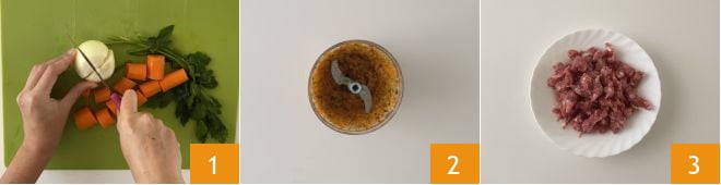 Para preparar los nidos de tallarines con ragú de salchicha, como primer paso pela las zanahorias y la cebolla. Córtalos en trozos grandes 1 y tritúralos en un procesador de alimentos junto con el tallo de apio 2. Desmenuza la salchicha en un plato y resérvala 3