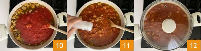 añade también el puré de tomate 10. Ajusta de sal 11 y pimienta, luego cubre con una tapa 12 y deja cocinar durante 40 minutos.