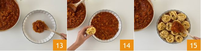 En este punto, toma una fuente para horno lo suficientemente grande para no superponer los nidos, y cubre el fondo con el ragú 13. Coloca encima los nidos de tallarines 14 y cubre con la salsa restante 15, asegurándote de cubrir bien la pasta, ya que se cocinará gracias a ella.