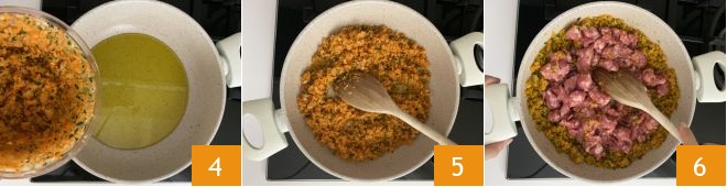 Vierte el aceite en una cacerola, añade el sofrito 4 y déjalo dorar durante un par de minutos 5. Añade la salchicha y déjala dorar 6