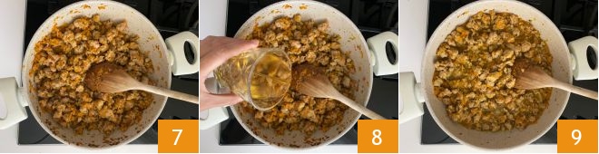 hasta que esté bien dorada 7. Agrega ahora el vino blanco para desglasar 8 y en cuanto la parte alcohólica se evapore completamente 9