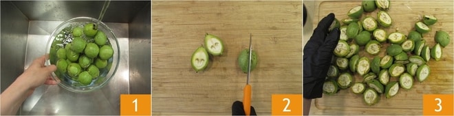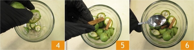 Para preparar tu nocino, comienza lavando bien las nueces frescas 1. Luego ponte guantes si es posible, ya que durante el proceso posterior tienden a manchar las manos. Corta las nueces por la mitad 2 3.