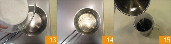 Prepara el jarabe: pon en una cacerola el agua y el azúcar 13. Tan pronto como hiervan y el azúcar se haya disuelto completamente, apaga el fuego 14. Vierte el jarabe en la jarra con la parte alcohólica 15.