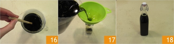 Mezcla bien 16 y con la ayuda de un embudo transfiérelo a una botellita 17. Consérvalo así durante 3-4 meses antes de disfrutarlo 18.