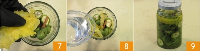 Añade también la cáscara de limón que habrás retirado con un pelador para no tomar la parte blanca, que resultaría amarga 7. Vierte el alcohol para cubrir 8 y cierra el tarro 9.