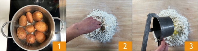 Para preparar los ñoquis de gorgonzola y nueces, empezad por la masa: poned las patatas en agua fría y hervid hasta que estén blandas 1. Verted la harina en la superficie de trabajo y haced un hueco en el centro 2, luego añadid aquí las patatas aún calientes pasadas por el prensapatatas 3.
